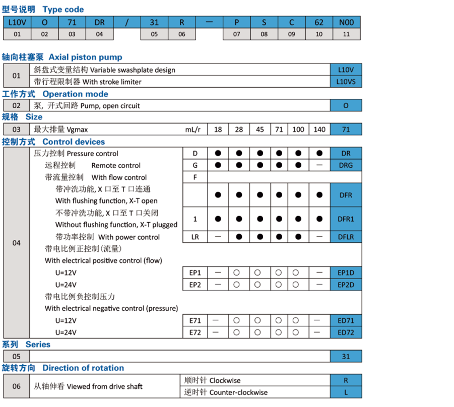 產品特點 -斜盤式軸向柱塞變量泵,用于開式回路 -滿足多種工況的控制方式 -良好的吸油填充性能 -通軸驅動可承載直至相同規格的泵